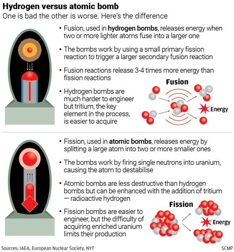 Then you have fusion bombs , also known as thermonuclear bombs or hydrogen bombs. These are much, much more powerful than fission bombs. Instead of splitting atoms, fusion bombs combine light atomic nuclei, typically isotopes of hydrogen like deuterium and tritium. This is the same process that powers the sun! Imagine forcing two small things together to make something a bit bigger, releasing even more energy than fission. The catch? Fusion reactions require extremely high temperatures and pressures to get started, which is where a fission bomb usually comes in. A fission bomb is often used as a trigger to create the necessary conditions for the fusion reaction to occur. So, you’ve got a fission bomb setting off a fusion bomb, making it a two-stage weapon with incredible destructive potential. Understanding this difference is crucial because it explains the escalating power of nuclear weapons over time.