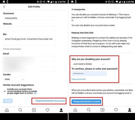 After selecting the reason, Instagram will ask you to re-enter your password to confirm that it’s you. Enter your password and tap the “Deactivate Account” button. This will temporarily disable your account, making your profile hidden from other users.