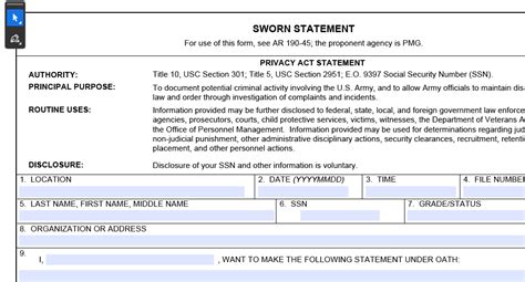 Once you’re ready to fill out the form, get familiar with the different sections. The form typically starts with your personal information: full name, rank, social security number, unit, and contact details. Then comes the statement itself, which is the heart of the form. Here, you’ll need to provide a detailed and chronological account of what you witnessed or experienced. It is essential to be as clear and concise as possible, avoiding any ambiguous language. Next, the form may include sections for attachments or supporting documentation. If you have any evidence to support your statement, this is where you should include it. Make sure you properly label and reference each attachment in your statement. Finally, the form includes a section for your signature, date, and any oath or affirmation. Read everything carefully before signing. Your signature confirms that you swear to the truthfulness of your statement.