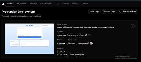 • Logs : You can access your application’s logs directly from the Vercel dashboard, making it easy to troubleshoot issues.