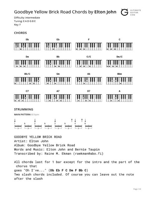 The strumming pattern in Goodbye Yellow Brick Road is crucial to capturing the song’s feel. A basic pattern that works well is Down, Down, Up, Down, Up. However, the song has a dynamic rhythm, so listen closely to the original recording and try to emulate Elton John’s style. Pay attention to the accents and subtle variations in the strumming. The song structure generally follows a verse-chorus pattern, with a bridge section that adds complexity. Understanding the structure will help you anticipate chord changes and play along with the song more effectively. Start by focusing on the verse and chorus, as these sections are repeated throughout the song. Once you’ve mastered these parts, move on to the bridge section, which may require a bit more practice. Remember to keep the tempo consistent and maintain a steady rhythm. A metronome can be a valuable tool for improving your timing. Also, try playing along with a recording of the song to get a feel for the timing and dynamics. Don’t be afraid to experiment with different strumming patterns and rhythms to find what works best for you. The most important thing is to have fun and enjoy the process of learning this iconic song. With practice and patience, you’ll be able to capture the essence of Goodbye Yellow Brick Road and impress your friends and family with your guitar skills!
