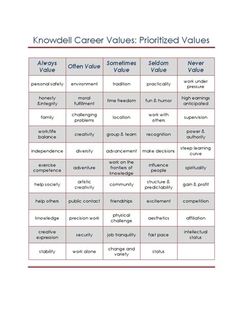 The Knowdell Values Card Sort is basically a self-assessment tool designed to help you identify your core values. These values are the things that are most important to you in life – the principles that guide your decisions and give you a sense of purpose. Think of them as your internal compass, always pointing you in the direction of what truly matters. Understanding these values can bring clarity to your career, relationships, and overall life direction. This tool helps to prioritize what you find most important, offering insights into why you make the choices you do. It’s a reflective process that allows individuals to understand themselves on a deeper level, aligning their actions with their intrinsic motivations and desires. Ultimately, it serves as a guide for creating a more fulfilling and authentic life.
