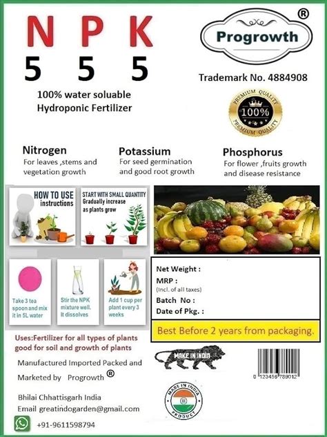 • 10-10-10: A balanced fertilizer that contains equal amounts of nitrogen, phosphorus, and potassium. Suitable for general-purpose use.