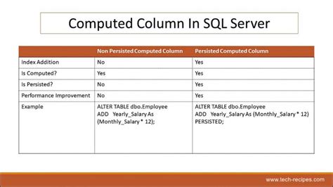 column – searching for specific names becomes super speedy. It’s like having your cake and eating it too! For calculated columns that are complex or computationally intensive, persisting them can also reduce the overall load on your CPU during read operations. Instead of recalculating a complex formula every time, the database just fetches the pre-calculated value. This can be a significant advantage in high-traffic environments. Moreover, computed columns can make your database schema more intuitive and self-documenting. When someone looks at your table definition, the name of the computed column and its expression clearly indicate how that value is derived. This reduces the learning curve for new developers or anyone trying to understand your data model. They can see the logic directly in the table definition. The ability to use functions within the expression also adds another layer of power. You can perform string manipulations, date calculations, mathematical operations, and more, all directly within the column definition. This keeps your business logic neatly encapsulated within the database layer, where it often belongs. So, in a nutshell, computed columns offer enhanced data integrity, simplified querying, potential performance boosts, better normalization, indexability, and improved schema understandability. Pretty sweet, right?