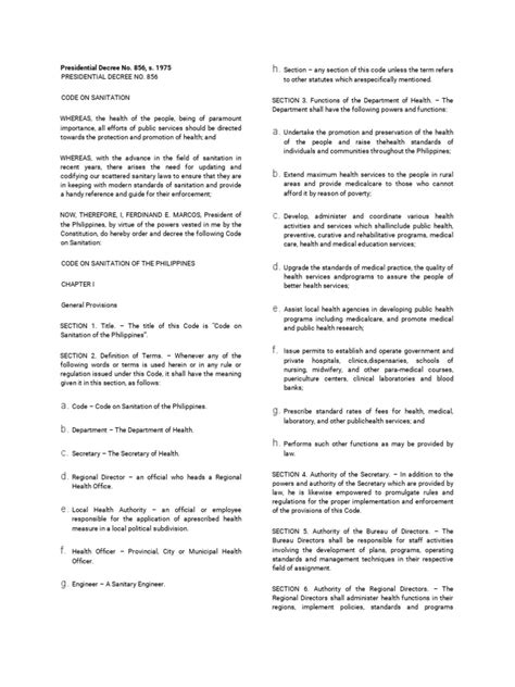 So, what exactly is Presidential Decree No. 856 , the Code on Sanitation? Alright, let’s get down to the nitty-gritty. This decree was signed into law back on December 23, 1975 , by then-President Ferdinand E. Marcos. The main gig of PD 856 is to consolidate and update all existing sanitation laws and regulations. Before this decree, sanitation rules were scattered across various laws, making them confusing and hard to enforce. PD 856 aimed to create a unified, comprehensive legal framework that would effectively promote and protect public health. The fundamental principle behind this code is the recognition that a clean and healthy environment is a basic human right and a critical factor for national development. It basically says, ‘Hey, we all deserve to live in a place that doesn’t make us sick!’ It empowers the government, particularly the Department of Health (DOH), to set and enforce sanitation standards across the board. Think of it as the rulebook for keeping our surroundings clean and safe, covering everything from the water we drink to the food we eat and the places we live and work in. It’s all about preventing diseases and ensuring that everyone has a shot at a healthy life. The decree lays out specific requirements for various sectors, aiming to prevent the spread of communicable diseases and promote general well-being. It’s a proactive approach to public health, focusing on prevention rather than just cure. This means establishing guidelines for waste disposal, food safety, water supply, and even pest control. It’s pretty comprehensive, guys, and its influence touches almost every aspect of our environment. The vision is clear: a healthier Philippines through better sanitation practices. It’s not just about rules; it’s about fostering a culture of cleanliness and responsibility. This foundational aspect of PD 856 is what makes it so enduring and relevant, even decades after its enactment. It’s a testament to the foresight of its framers in recognizing the crucial link between environmental sanitation and public health.